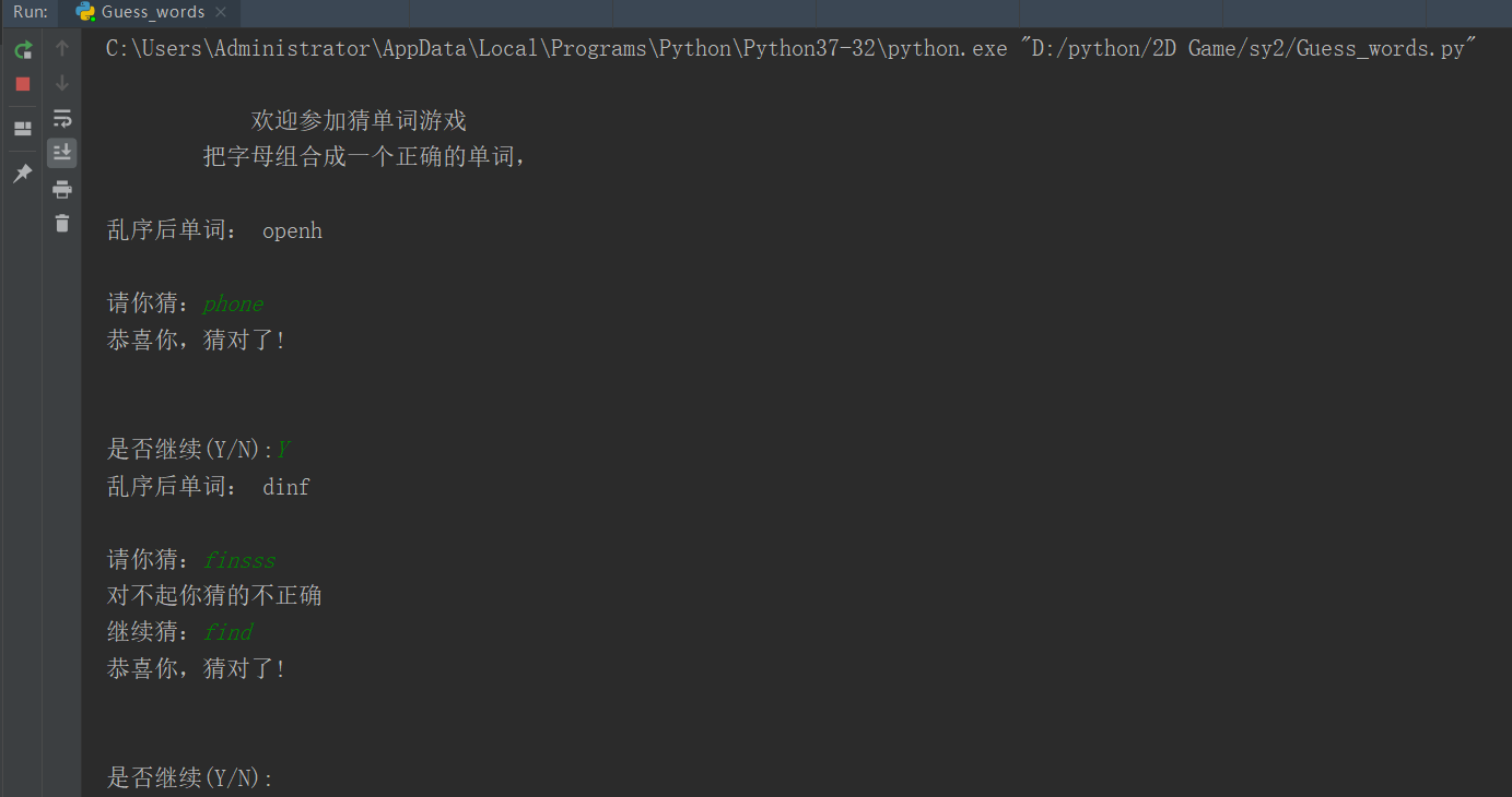 - 游戏介绍: 猜单词游戏就是计筧机随机产生一个单词,打乱字母顺序,供玩家去猜测。此游戏采用控制字符界面,游戏中,可使用序列中的元组存储所有待猜测的单词。因为猜单词游戏需要随机产生某个待猜测单词以及随机数字,所以引入random模块随机数函数。其中,random.choice()可以从序列中随机选取元素。