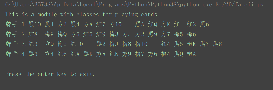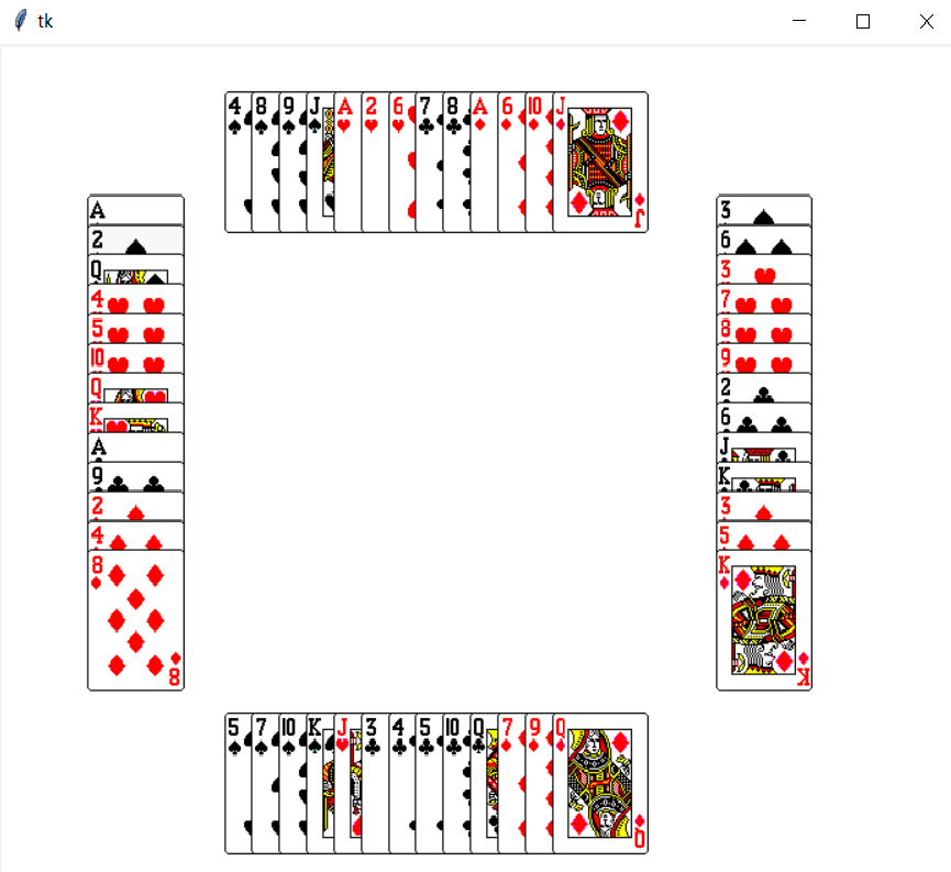 - 游戏介绍: 四名牌手打牌,电脑随机將52张牌(不合大、小王)发给四名牌手,并在屏幕上显示每位牌手的牌。