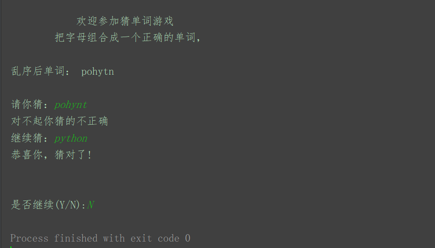 - 游戏介绍: 猜单词游戏就是计筧机随机产生一个单词,打乱字母顺序,供玩家去猜测。此游戏采用控制字符界面,游戏中,可使用序列中的元组存储所有待猜测的单词。因为猜单词游戏需要随机产生某个待猜测单词以及随机数字,所以引入random模块随机数函数。其中,random.choice()可以从序列中随机选取元素。