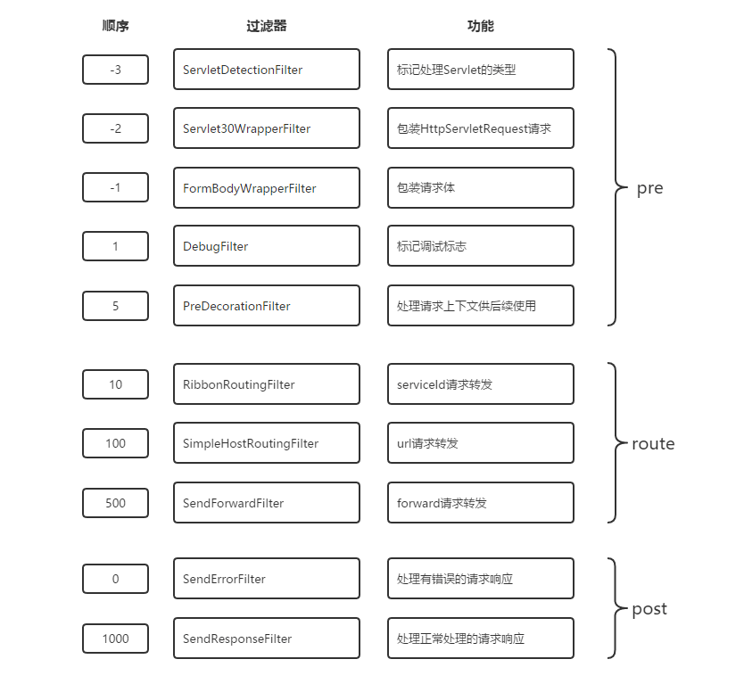 Filter是Zuul的核心,在ZuulServerAutoConfiguration和ZuulProxyAutoConfiguration定义了很多Filter,主要包括以下Filter
