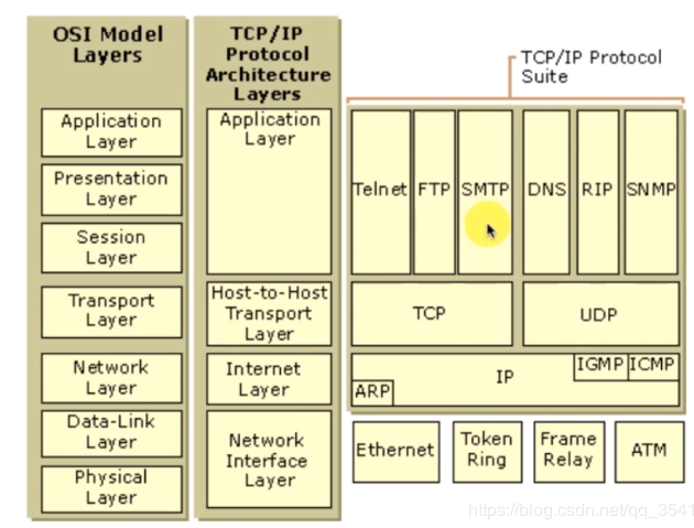 - 七层:应用层-》表示层-》会话层-》传输层-》网络层-》数据链路层-》物理层(电信号/光信号)