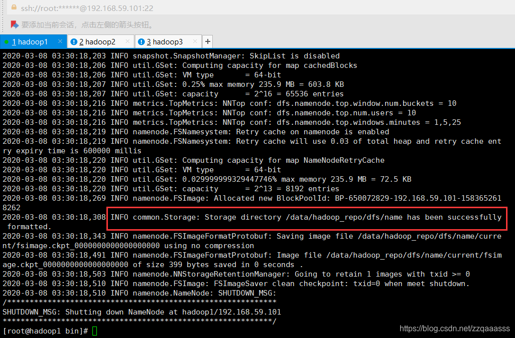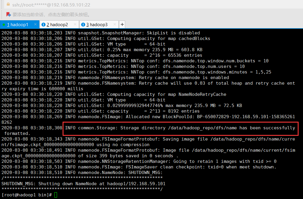 在hadoop1中切换到hadoop目录下,执行如下命令: