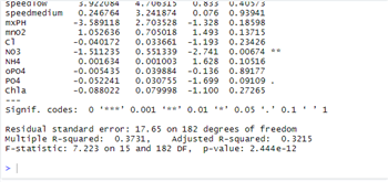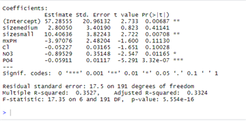 在构造多元线性回归模型中,用knnImputation函数用欧氏距离来寻找距离个案最近的k个邻居,用中位数填补缺失值。得到的数据框clean.algae将不含有缺失值。接下来建立一个用于预测海藻频率的线性回归模型:
