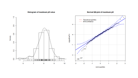 rug(jitter(algaemxPH)) windows() qqPlot(algaemxPH))windows()qqPlot(algaemxPH, main=‘Normal QQ plot of maximum pH’)