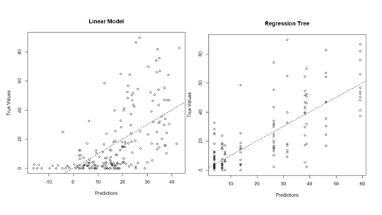 可以看出线性预测的结果是13.10681,回归树得到的结果是8.480619。