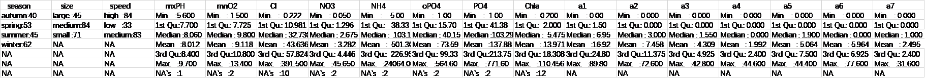 每个记录有11个变量,其中3个变量是名义变量,它们分别描述水样收集的季节、收集河流的大小和河水速度。余下的8个变量是所观察水样的不同化学参数,即最大pH值、最小含氧量(O2)、平均氯化物含量(cl)、平均硝酸盐含量(NO3)、平均氨含量(NH4)、平均正磷酸含量(PO4)、平均磷酸盐含量(PO4)、平均叶绿素含量。与这些参数相关的是7种不同有害藻类在相应水样中的频率数目。并未提供所观察藻类的名称的有关信息。