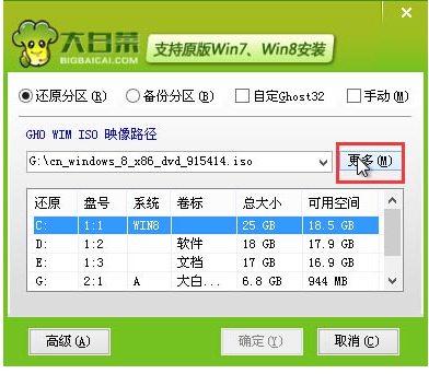在进入大白菜装机版pe系统桌面后,会自动弹出大白菜PE装机工具窗口,此时点击“浏览(B)”进入下一步操作。如下图所示