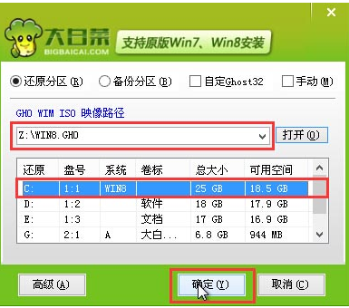 接着我们打开存放在制作好的大白菜u盘启动盘中的ghost win10系统镜像包,点击“打开(O)”进入下一步操作。等待装机工具所需要的系统文件之后,在下方磁盘列表中选择一个磁盘分区(一般默认是C盘)做为安装系统使用,然后点击“确定(Y)”进入下一步操作。如下图所示 。