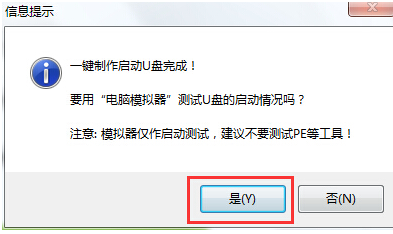 1.3完成写入之后,在弹出的信息提示窗口中,点击“是(Y)”进入模拟电脑。如下图所示