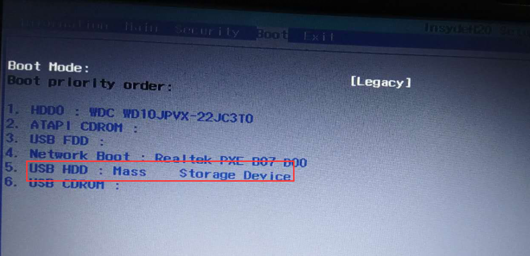 通过【←】【→】移动到【Boot】菜单,可以看到如下,在通过【F6】将【USB HDD】上移到第一位上,