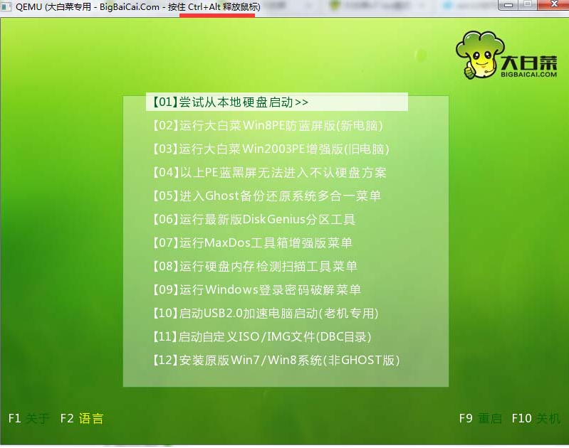 1.4模拟电脑成功启动说明大白菜u盘启动盘已经制作成功,按住Ctrl+Alt释放鼠标,点击关闭窗口完成操作。如下图所示 。