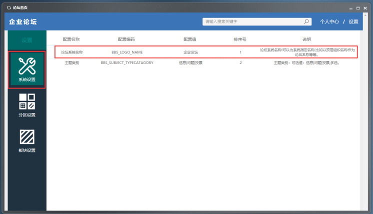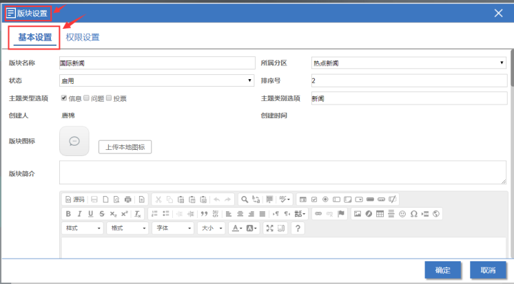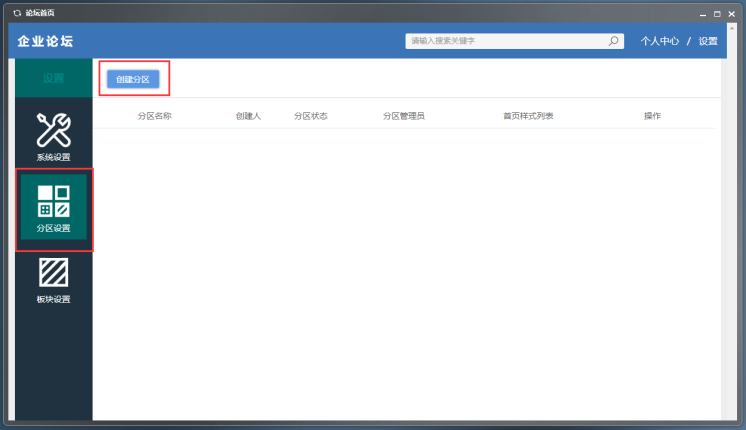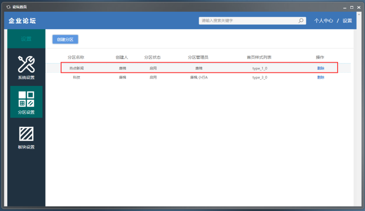分区设置里的创建人和所选择的管理人,都有权限在相应的分区里进行下一步的板块设置。