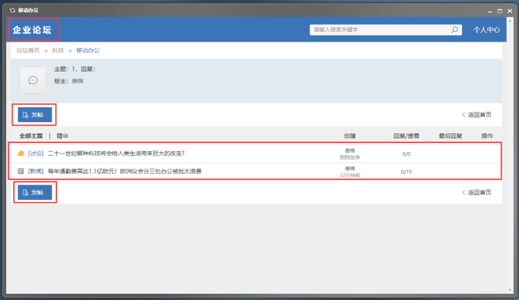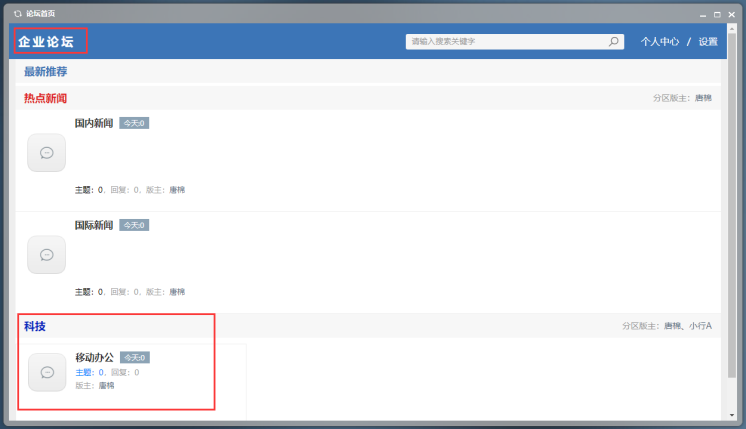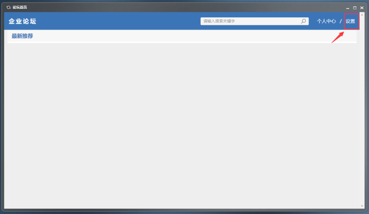 在系统设置、分区设置和板块设置完成后,点击左上角论坛名字企业论坛,弹出论坛页面。或,关闭页面,回到系统菜单点击论坛重新进入。