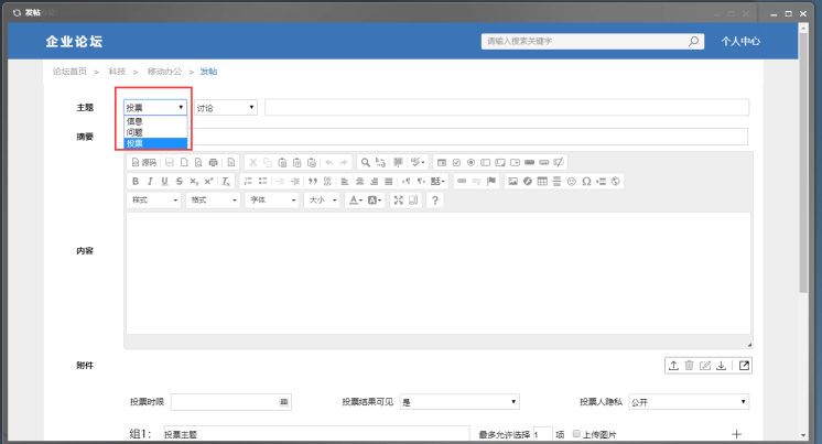 填写投票主题,如若该次投票有多个投票内容,可以选择添加投票组 |