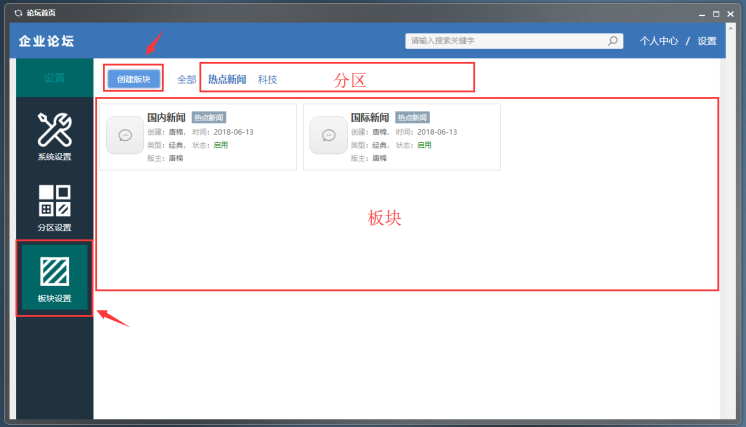 点击板块设置-创建板块,即可创建新的板块并展示在板块区。