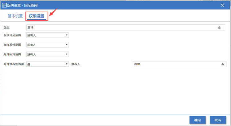 用于设置该模块的版主、可见范围、发帖人回复人等权限