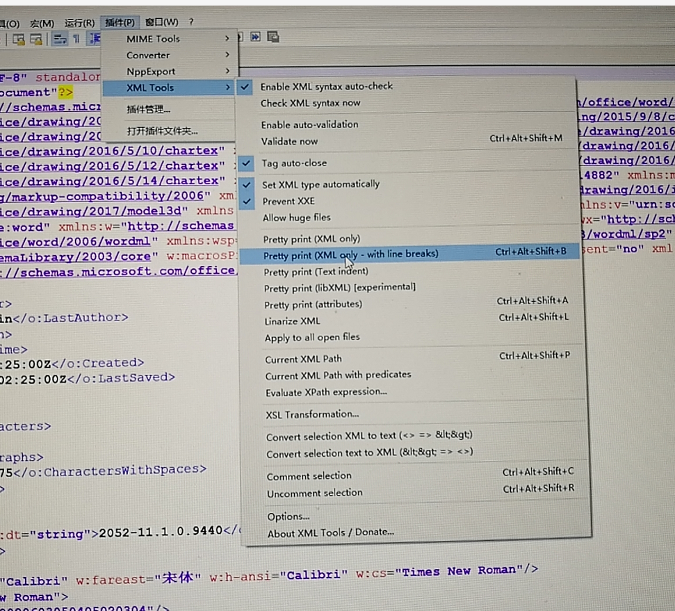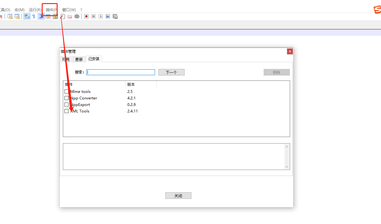4.打开temp.xml文件,使用Notepad++文本编辑器,需要安装一个组件,选择插件=》插件管理,进入插件列表,并在可用里面搜索:Xml tool,并进行安装,安装后如下:
