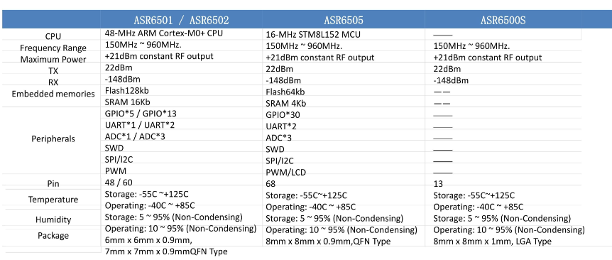 随着LORA无线在LPWAN(低功耗广域网)不断的深入的应用,在全球的物联网的基础概念, LORA物联网项目从概念到落地。在国内的LPWAN快速发展,大概分为NB跟LORA两大阵营;NB主要是移动运营商负责,优势在于公共领域的LPWAN,LORA主要是LORA联盟的客户在运营负责;LORA优势在于适用校区,工业园区,小区物业 能满足社区的温度,湿度,消防安全,人员定位等等领域;随着2018年9月份开始,SEMTECH对阿里的SX1262 IP内核授权;最后IP内核由ASR方面设计,及销售;现在介绍ASR的主要几款LORA芯片的特点: