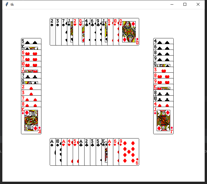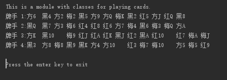 四名牌手打牌,电脑随机將52张牌(不合大、小王)发给四名牌手,并在屏幕上显示每位牌手的牌。