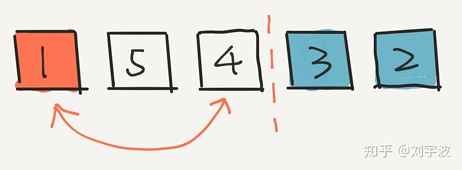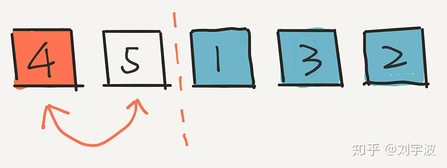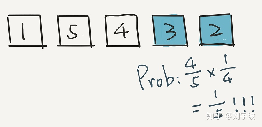 即 1 首先在第一轮没被选中,概率是 4/5,在第二轮又没被选中,概率是 3/4 ,但是在第三轮被选中了,概率是 1/3。乘在一起,4/5 * 3/4 * 1/3 = 1/5。 用这个方法计算,任意一个元素出现在中间位置的概率,都是 1/5。 这个过程继续,现在,我们只剩下两个元素了,在剩下的两个元素中,随机选一个,比如是4。将4放到第二个位置。