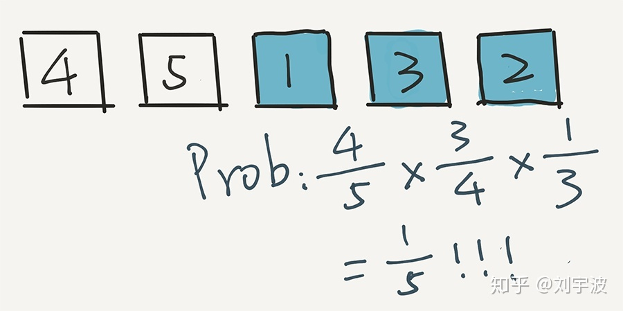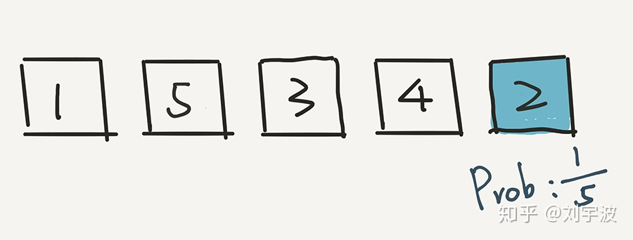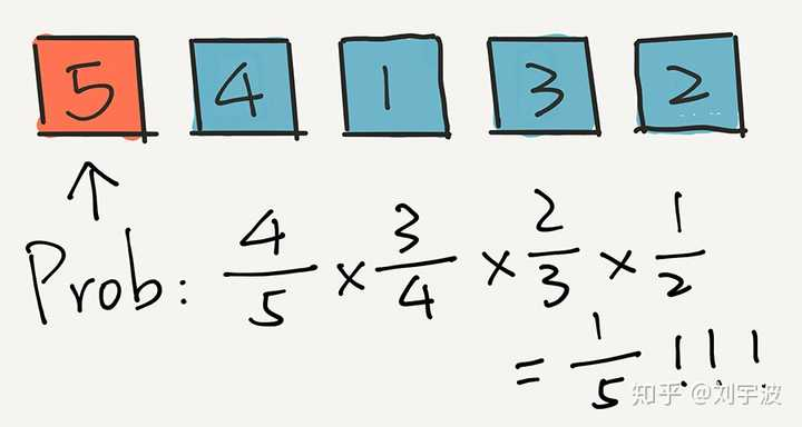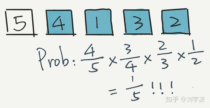 下面,我们计算 2 出现在最后一个位置的概率是多少?非常简单,因为是从 5 个元素中选的嘛,就是 1/5。实际上,根据这一步,任意一个元素出现在最后一个位置的概率,都是 1/5。