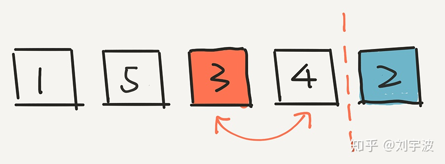 下面,根据这个算法,我们就已经不用管 2 了,而是在前面 4 个元素中,随机一个元素,放在倒数第二的位置。假设我们随机的是 3。3 和现在倒数第二个位置的元素 4 交换位置。
