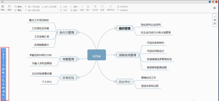 左边工具栏可以提供不同的脑图视图,放大缩小、允许拖拽、展开节点、选择、预览、模板等。