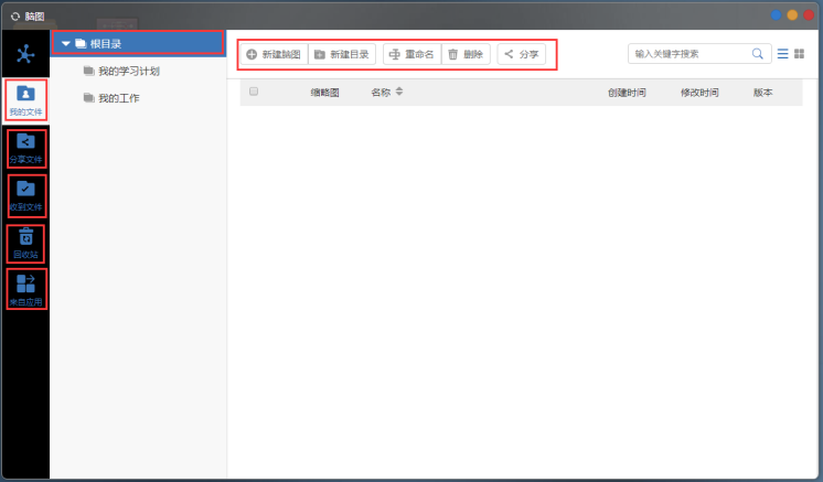 点击组件-脑图,即可打开脑图系统。首页左边为我的文件、分享文件、收到文件、回收站、来自应用;中间为各文件的目录;右边为操作条及展示区。