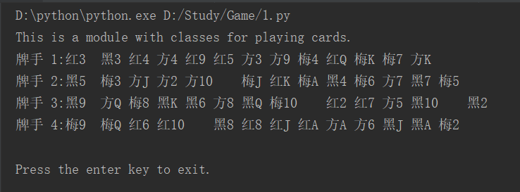 if __name__ == "__main__": print("This is a module with classes for playing cards.") players = [Hand(), Hand(), Hand(), Hand()] poke1 = Poke() poke1.populate() # 生成一副牌 poke1.shuffle() # 洗牌 poke1.deal(players, 13) # 发给玩家每人13张