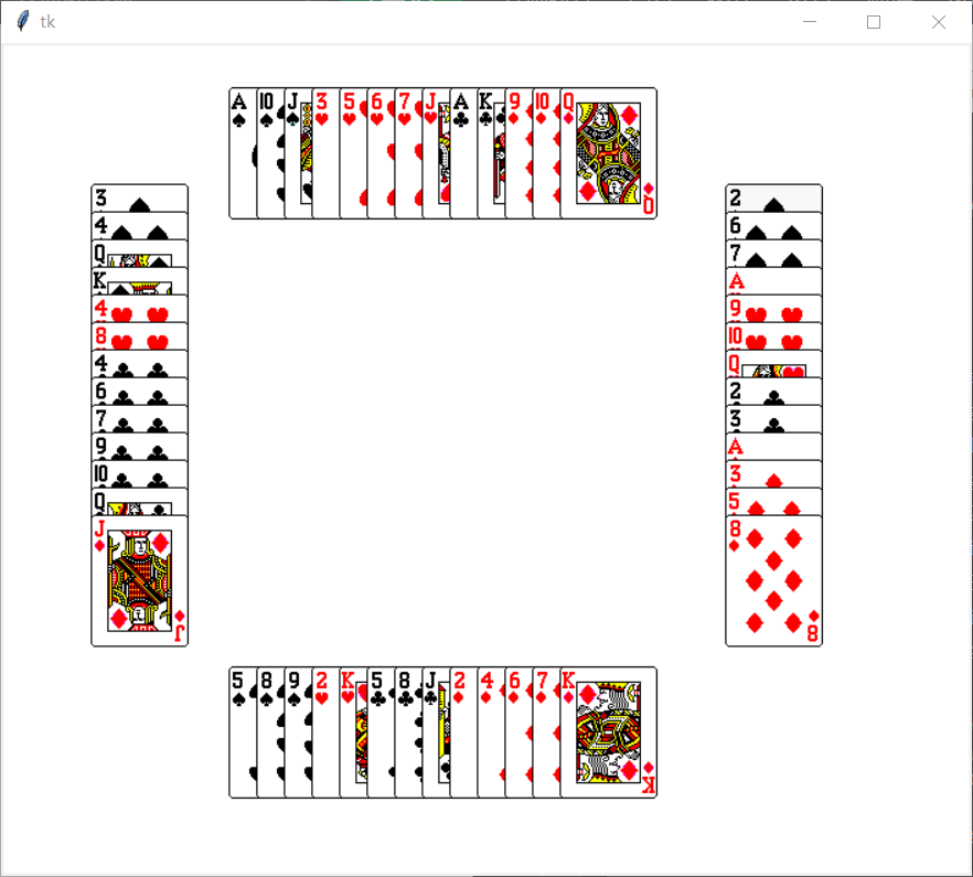 from tkinter import * import random n=52 def gen_pocker(n): x=100 while(x>0): x=x-1 p1=random.randint(0,n-1) p2=random.randint(0,n-1) t=pocker[p1] pocker[p1]=pocker[p2] pocker[p2]=t return pocker pocker=[i for i in range(n)] pocker=gen_pocker(n) print(pocker) (player1,player2,player3,player4)=([],[],[],[]) (p1,p2,p3,p4)=([],[],[],[]) root=Tk() cv=Canvas(root,bg='White',width=700,height=600) imgs=[] for i in range(1,5): for j in range(1,14): imgs.insert((i-1)*13+(j-1),PhotoImage(file='images\\'+str(i)+'-'+str(j)+'.gif')) for x in range(13): m=x*4 p1.append(pocker[m]) p2.append(pocker[m+1]) p3.append(pocker[m+2]) p4.append(pocker[m+3]) p1.sort() p2.sort() p3.sort() p4.sort() for x in range(0,13): img=imgs[p1[x]] player1.append(cv.create_image((200+20*x,80),image=img)) img=imgs[p2[x]] player2.append(cv.create_image((100 ,150+20 * x), image=img)) img = imgs[p3[x]] player3.append(cv.create_image((200 + 20 *x, 500), image=img)) img = imgs[p4[x]] player4.append(cv.create_image((560,150+20 * x), image=img)) print("player1:",player1) print("player2:",player2) print("player3:",player3) print("player4:",player4) cv.pack() root.mainloop()