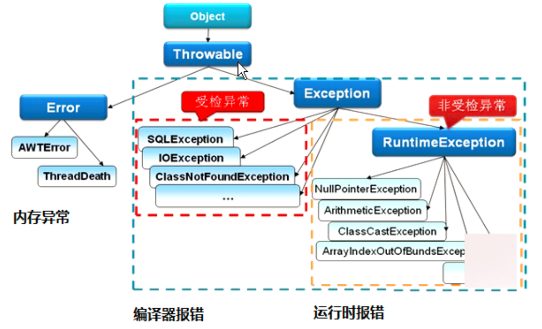 一个是运行时异常:RuntimeException 如 : NullPointerException 、 ClassCastException ;