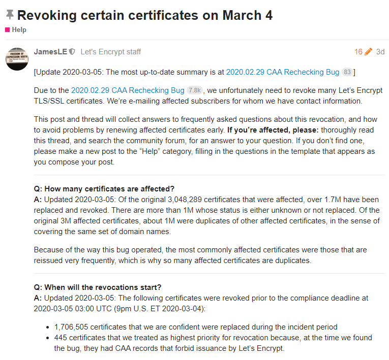 由于CAA代码中存在Bug,免费证书颁发机构Let’s encrypt决定吊销300多万张客户证书。由于事发突然,Let’s encrypt仅对有联系方式的用户进行了邮件通知,且从通知到吊销留给用户的更新时间不足24小时,可能造成大量用户无法及时更新证书,出现网站业务中断,造成直接经济损失。