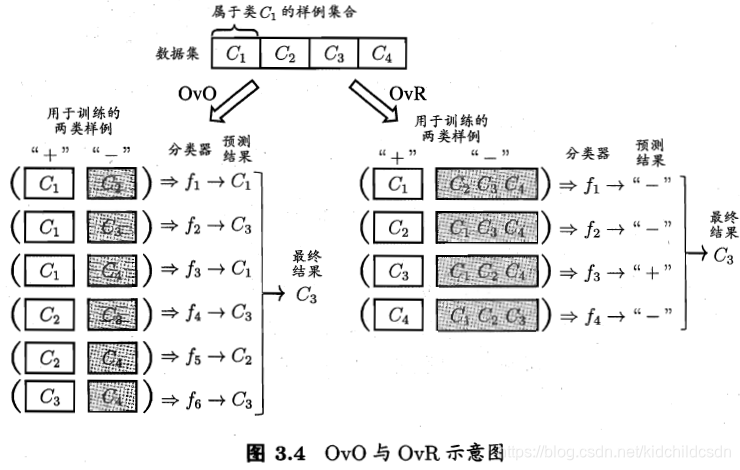 ,多分类学习的基本思想是“拆解法”,就是我们可以将其拆解为多个二分类的任务,训练多个分类器,最后将这些分类器的预测结果进行集成来获得多分类任务的结果。采用这种方式的关键就在于如何拆分,如何将分类器的结果集成。