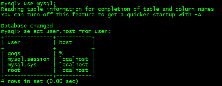 3.修改root用户的host字段,命令:update user set host="%" where user="root"