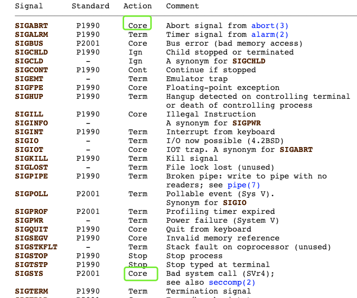 linux有很多默认行为是打coredump的信号,但是有些信号被mysql捕获自己做了处理,比如SIGABRT,所以这里我们用SIGSYS