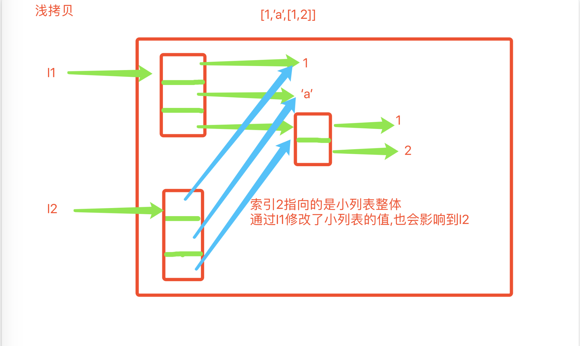 对浅拷贝来说没知识在内存中重新创建了一个空间存放一个新列表,但是新列表中的元素与原列表的元素是公用的