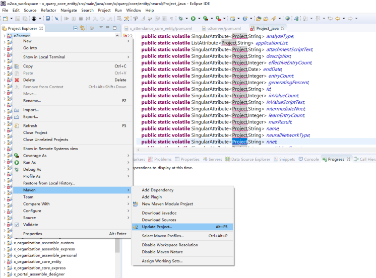 当所有的依赖包下载完成后,eclipse里如果仍有大量报错,请在o2server项目上执行Maven -> Update Project...