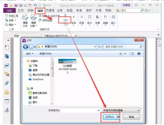 打开需要修改的文档, 点击“编辑”--“添加图像”--“从文件创建图像”,选择要添加的图像,点击“打开”: