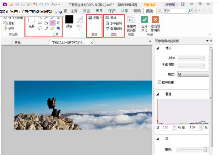 若需要对添加的图像或原有图像行编辑,可以点击“图像编辑-图像”,双击选择图像,得到放大后的图像,此时可对图像进行修改。其中,工具、滤镜、图像等是日常使用较频繁的功能: