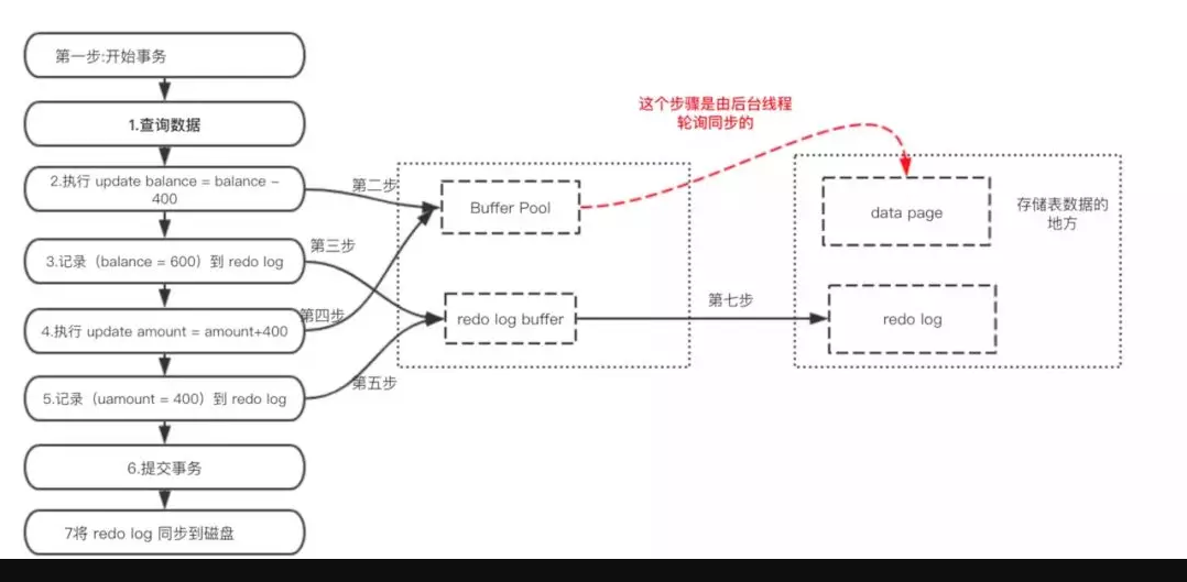 mysql 为了提升性能不会把每次的修改都实时同步到磁盘,而是会先存到Buffer Pool(缓冲池)里头,把这个当作缓存来用。然后使用后台线程去做缓冲池和磁盘之间的同步。