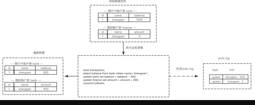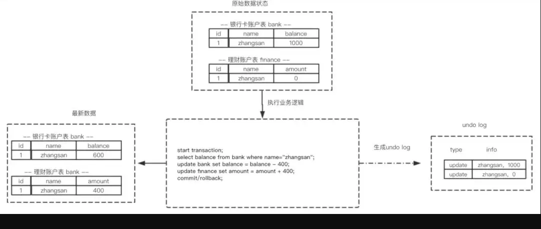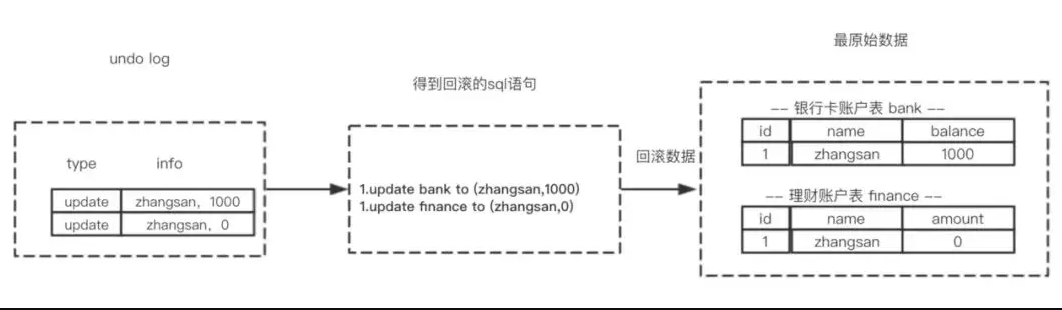 为了做到同时成功或者失败,当系统发生错误或者执行rollback操作时需要根据undo log 进行回滚
