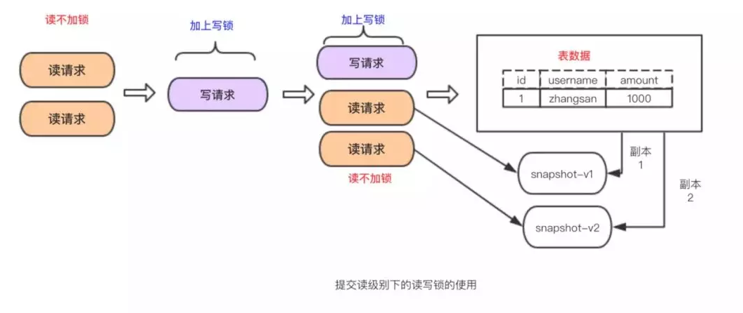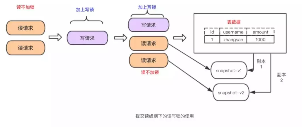 InnoDB在 READ COMMITTED,使用排它锁,读取数据不加锁而是使用了MVCC机制。或者换句话说他采用了读写分离机制。