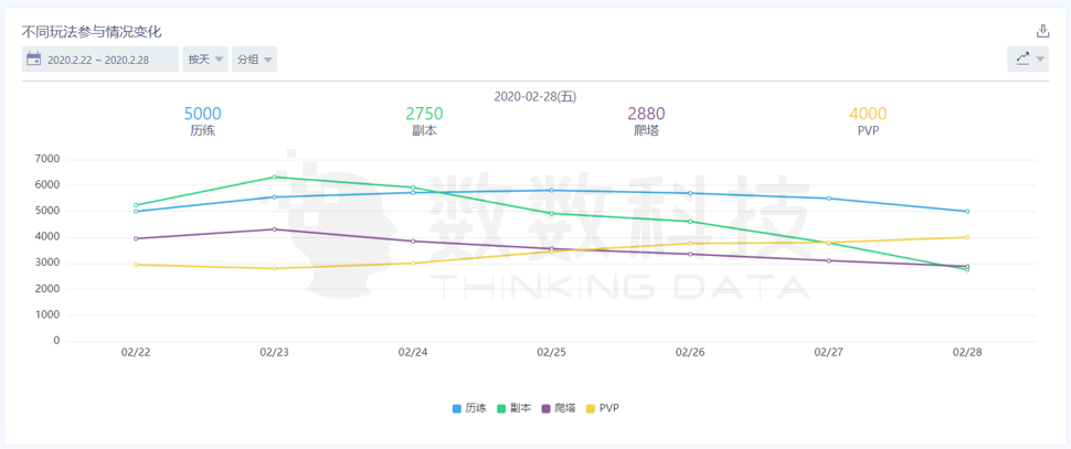 通过数据分析平台发现,这款游戏的历练玩法参与次数稳定,副本、爬塔玩法的参与次数随着时间都有所降低,PVP玩法有所攀升。所以可以预估到,玩家每日行为从历练+副本+爬塔,转向了历练+PVP。而历练却是偏日常挂机类玩法,变化不大也是正常的。