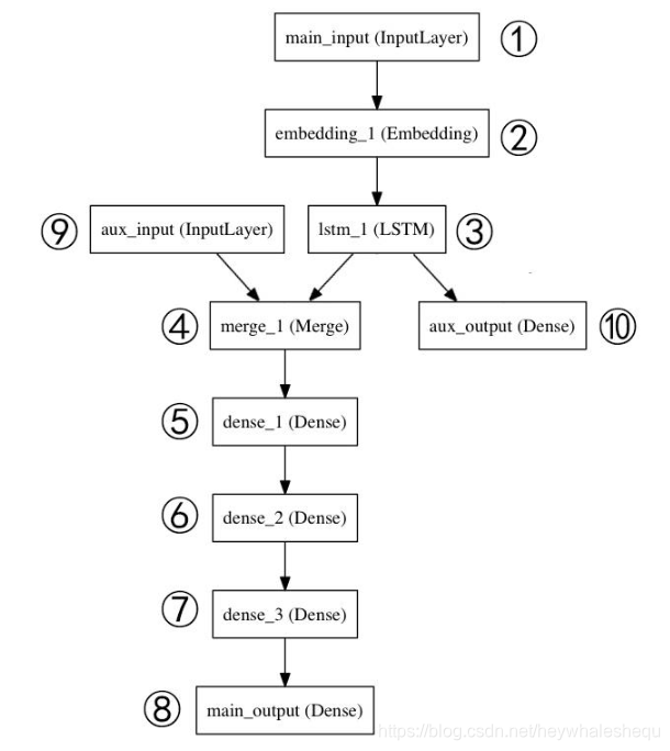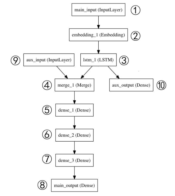 model = Model(inputs=[main_input, auxiliary_input], outputs=[main_output, auxiliary_output])