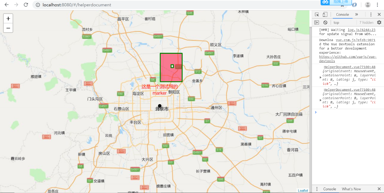 页面长成这个样子,因为仅作示例用,所以写在了helpdocument上面,除了地图外,覆盖物有一个点、一个标签、一个面,右侧是chrome浏览器的开发者工具(crtl+shift+i),触发事件在工具上(console)打印了日志。
