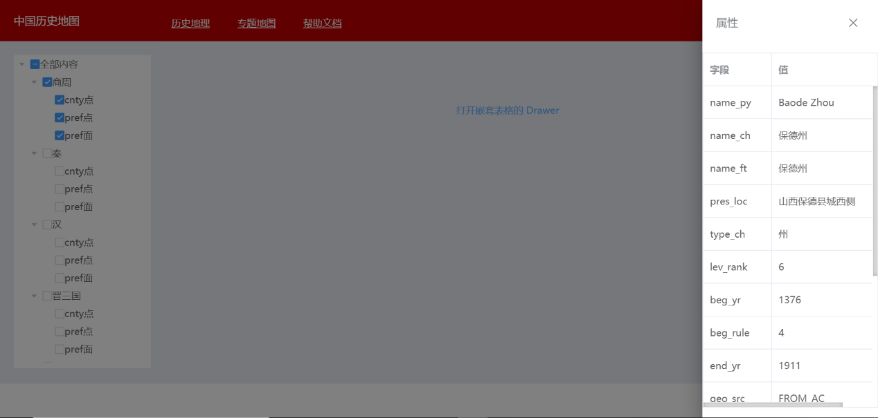 大概长这个样子:顶部三个tab标签,历史地图、专题地图、帮助文档;左侧一栏树状复选框,用以选择朝代,中间部分是地图,右侧是一个可隐藏的表,用以显示属性。