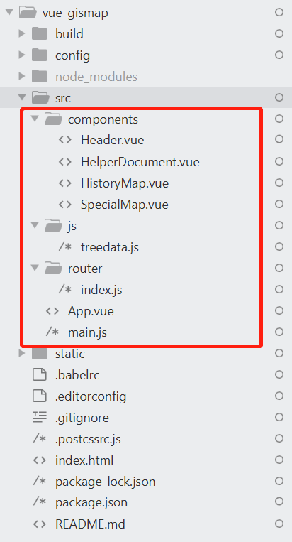 文件结构如下图所示,src文件夹下有components、js、router三个文件夹。