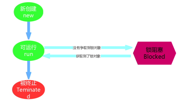 Blocked状态在API中的介绍为:一个正在阻塞等待一个监视器锁(锁对象)的线程处于这一状态。我们已经学完同步机制,那么这个状态是非常好理解的了。比如,线程A与线程B代码中使用同一锁,如果线程A获取到锁,线程A进入到Runnable状态,那么线程B就进入到Blocked锁阻塞状态。这是由Runnable状态进入Blocked状态。除此Waiting以及Time Waiting状态也会在某种情况下进入阻塞状态。