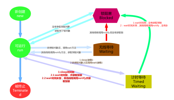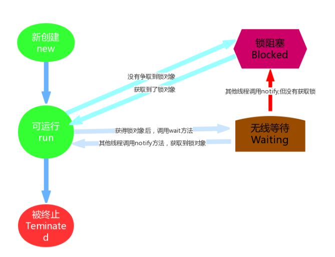 Wating状态在API中介绍为:一个正在无限期等待另一个线程执行一个特别的(唤醒)动作的线程处于这一状态。 一个调用了某个对象的 Object.wait 方法的线程会等待另一个线程调用此对象的Object.notify()方法 或 Object.notifyAll()方法。其实waiting状态并不是一个线程的操作,它体现的是多个线程间的通信,可以理解为多个线程之间的协作关系,多个线程会争取锁,同时相互之间又存在协作关系。就好比在公司里你和你的同事们,你们可能存在晋升时的竞争,但更多时候你们更多是一起合作以完成某些任务。当多个线程协作时,比如A,B线程,如果A线程在Runnable(可运行)状态中调用了wait()方法那么A线程就进入了Waiting(无限等待)状态,同时失去了同步锁。假如这个时候B线程获取到了同步锁,在运行状态中调用了notify()方法,那么就会将无限等待的A线程唤醒。注意是唤醒,如果获取到锁对象,那么A线程唤醒后就进入Runnable(可运行)状态;如果没有获取锁对象,那么就进入到Blocked(锁阻塞状态)。