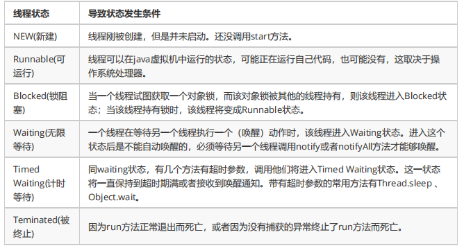 这里先列出各个线程状态发生的条件,下面将会对每种状态进行详细解析